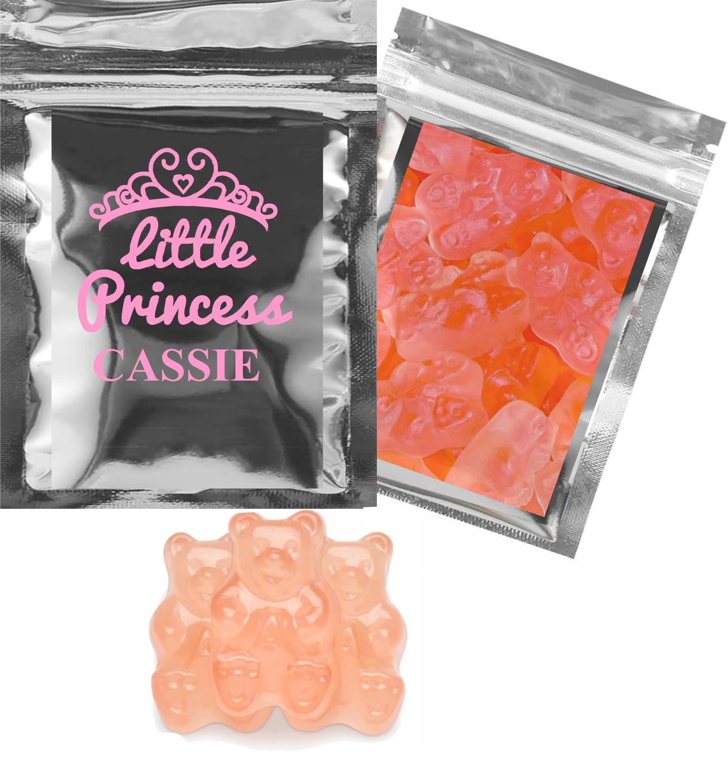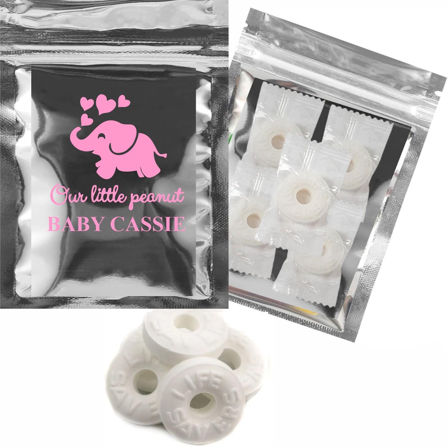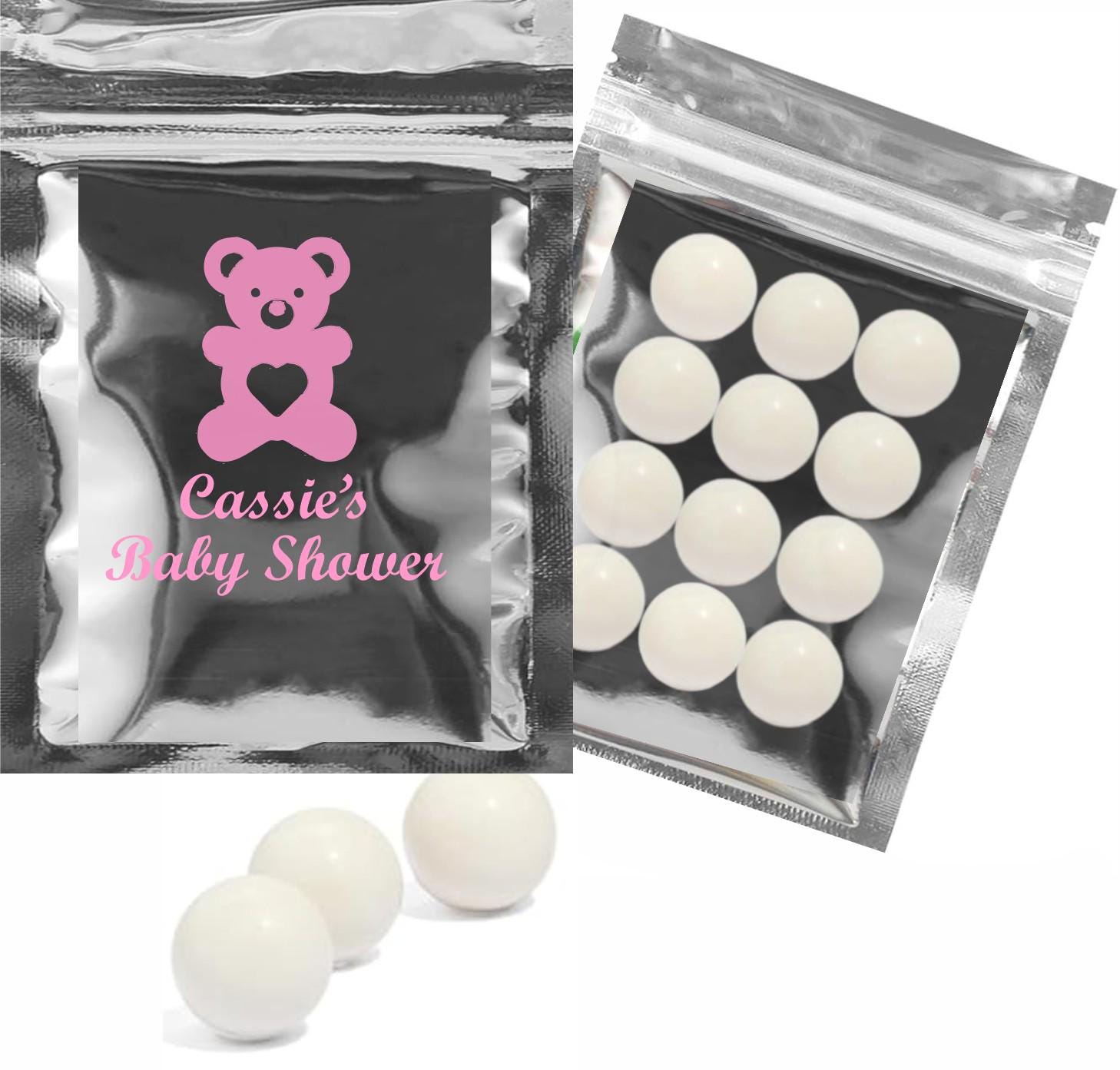 Food Safe Foil Packs Have a Personalized Sticker attached and You can Choose to have them Filled with one of our Many Candy Options, Jelly Beans, Gummy Bears, Lifesavers, M&M'S, Gumballs and Pacifier Candy.