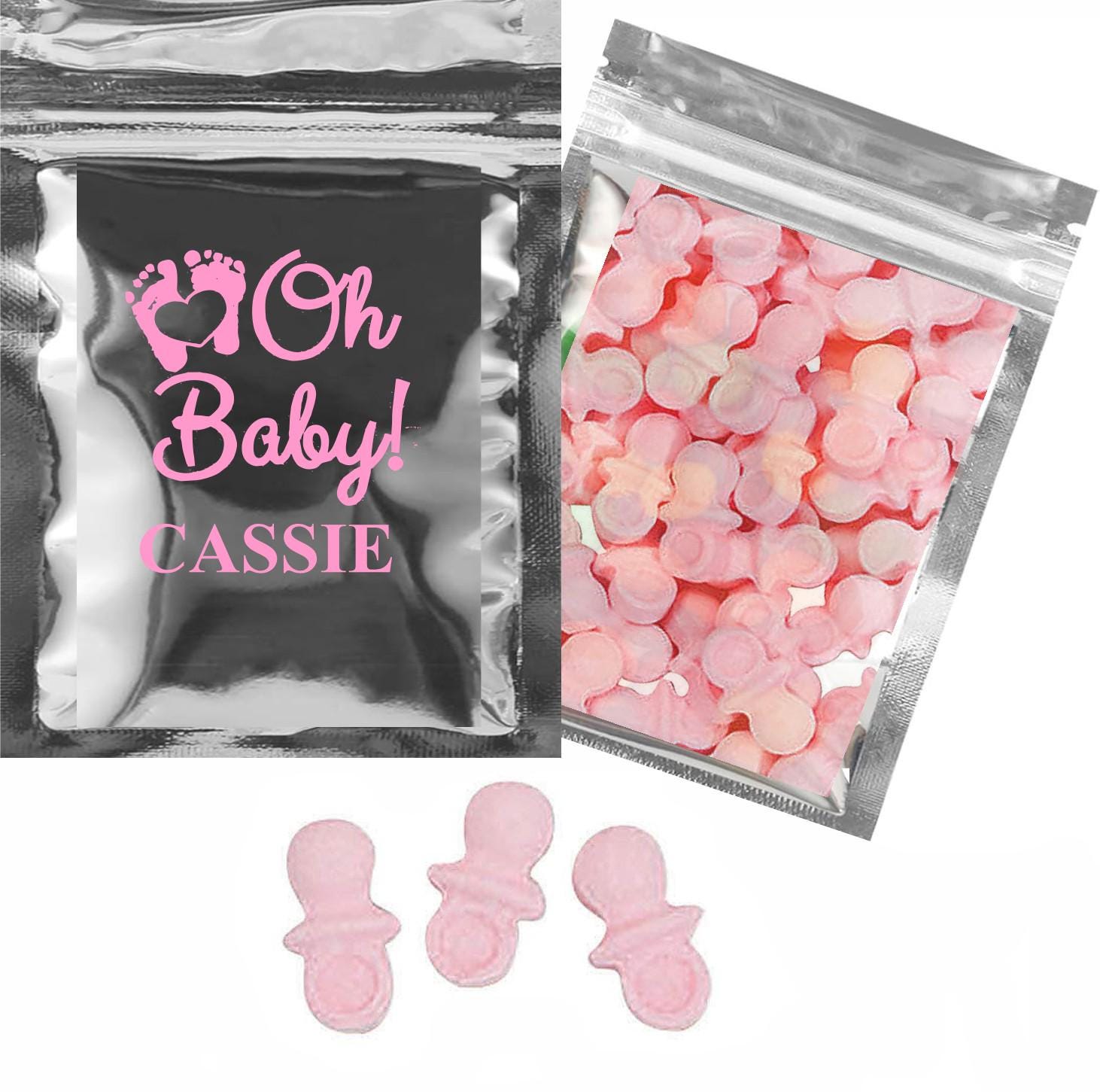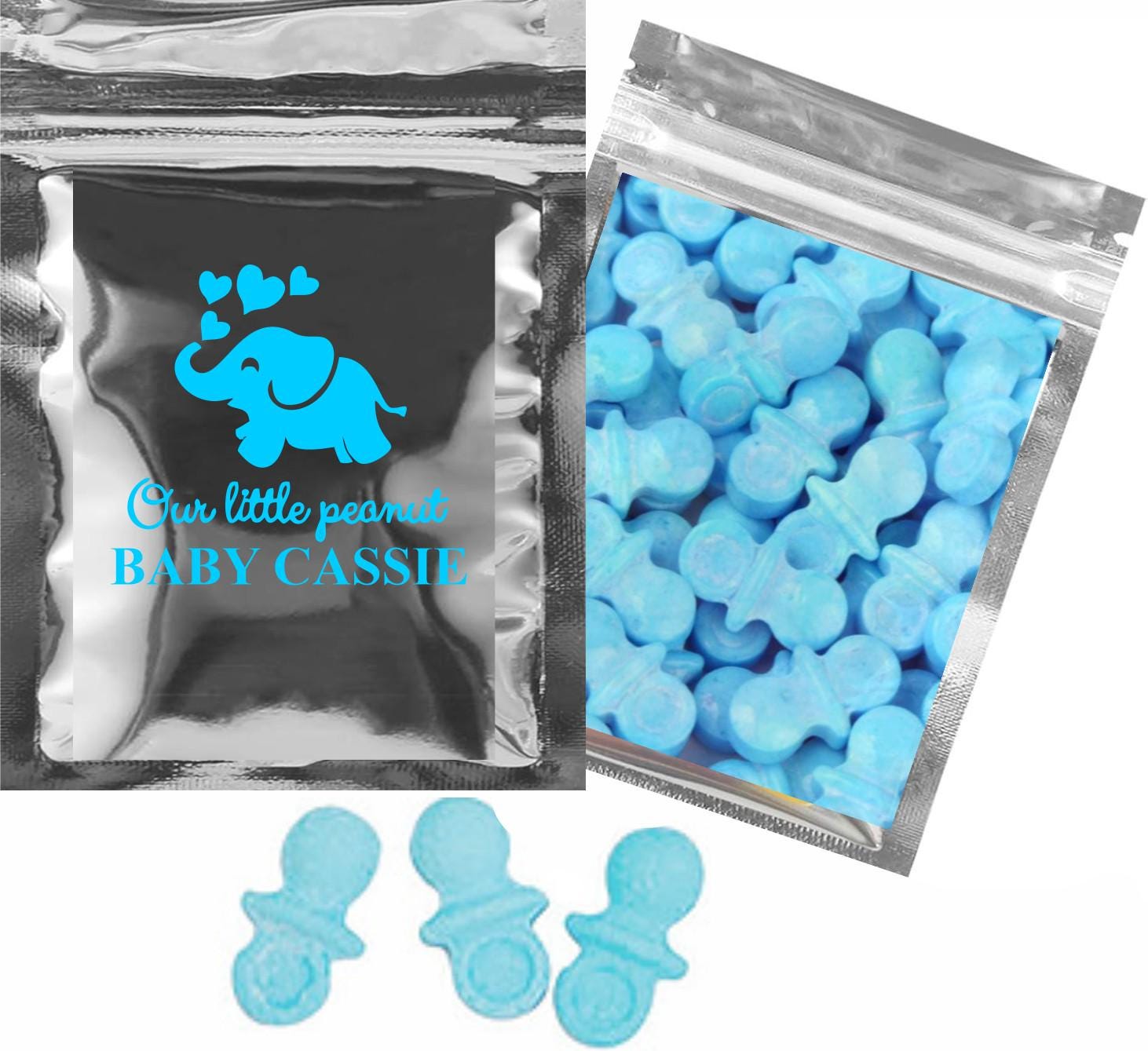 Oh Baby! a newborn baby is about to arrive and our Baby Shower Pacifier Candy favors will add a special touch to your Party or Event. Edible Candy favors will Make your baby shower, baby reveal, or sprinkle unforgettable with these personalized candy bag favors! Each bag is filled with your choice of sweet treats, including jelly beans, gummy bears, gumballs, mints, and more, perfect for guests to enjoy. The silver foil bags are food-safe and add a touch of elegance to your party. You can customize the bags with one of our many unique baby shower designs, such as "Twinkle Twinkle Little Star," "Our Little Peanut," and more, to match your theme perfectly. These custom baby shower party favors are a fun, edible, and thoughtful gift for your guests. Perfect for baby showers, gender reveals, or baby sprinkle events, these candy-filled personalized bags will leave a lasting impression. Let your celebration be as sweet as your treats!