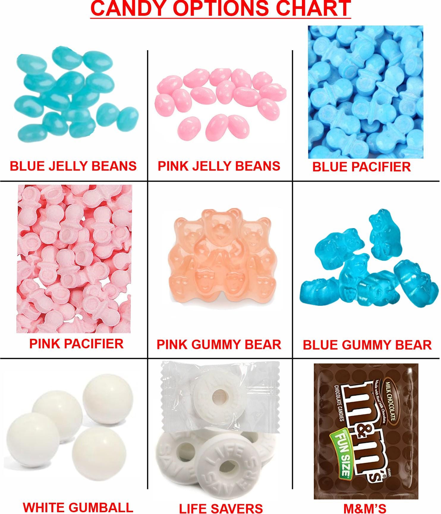 - Candy Options, Jelly Beans, Gummy Bears, Lifesavers, M&M'S, Gumballs and Pacifier Candy