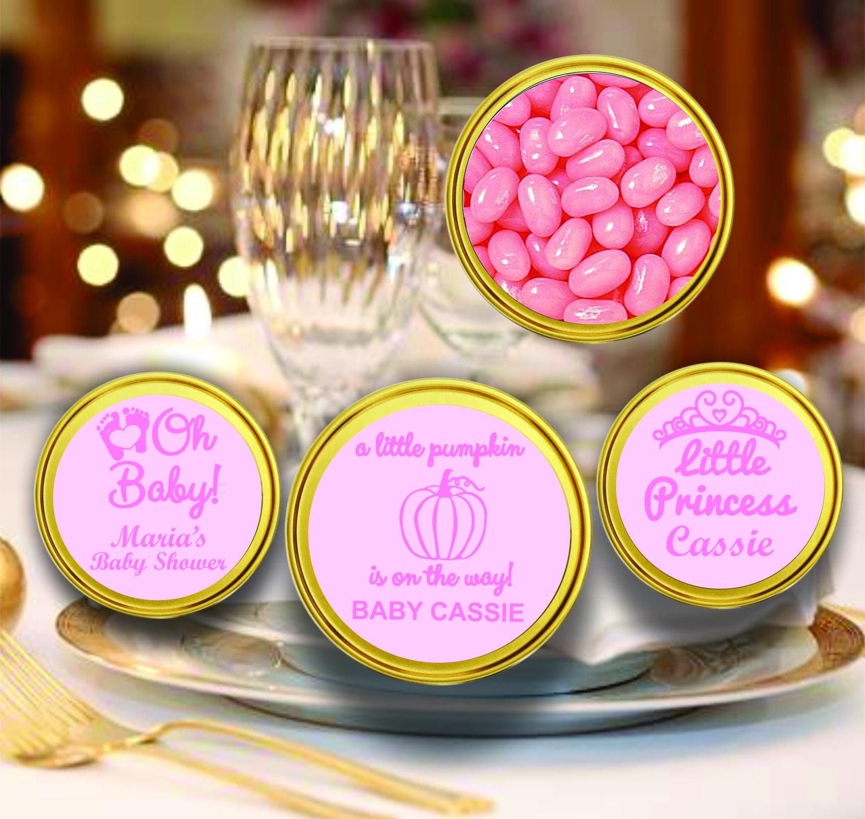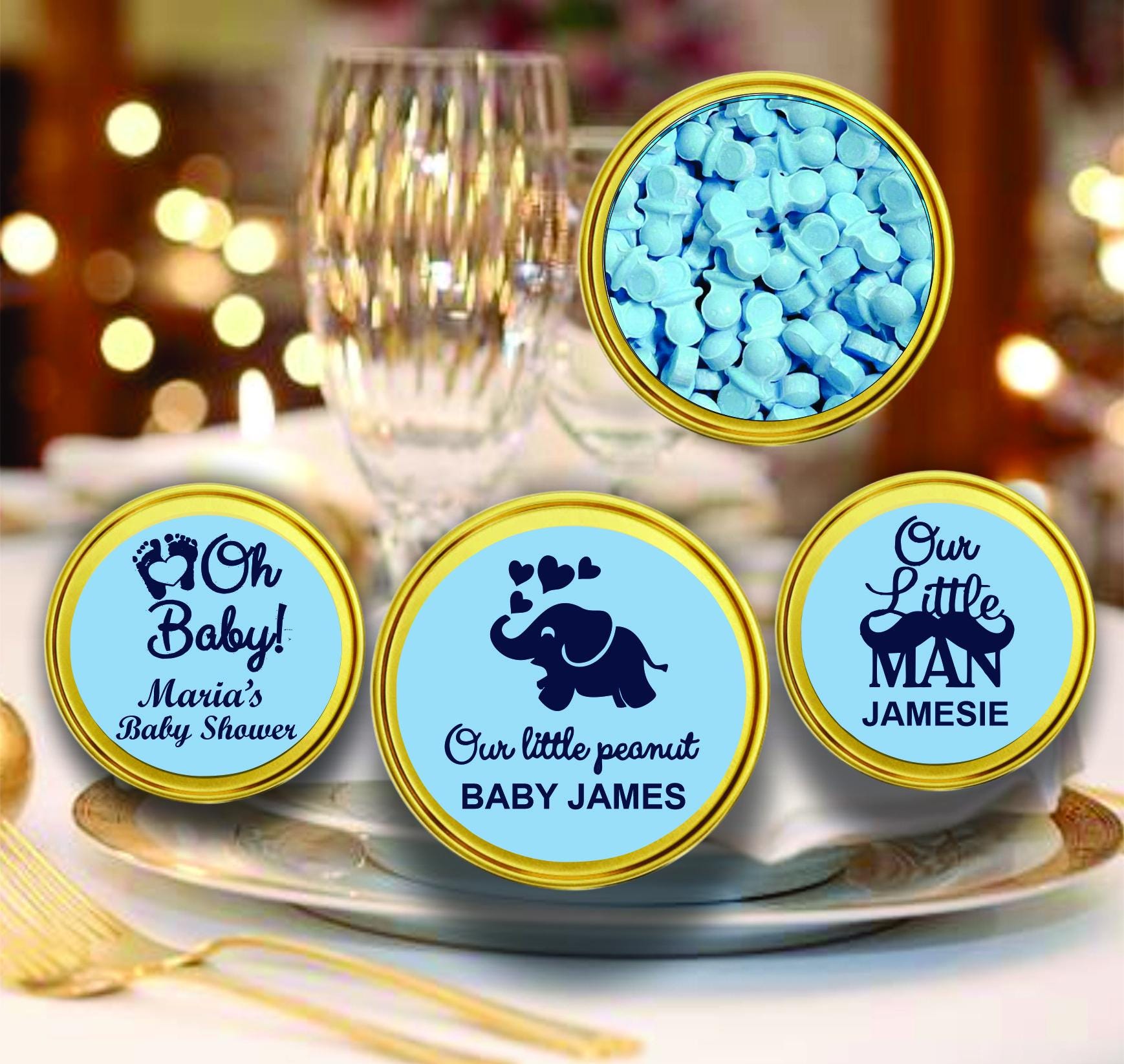 Choose to fill them with your favorite treats like pillow mints, gummy bears, or jelly beans, or leave them empty to fill with your own goodies. Each tin is customized with your baby's name or event details for a truly special touch.