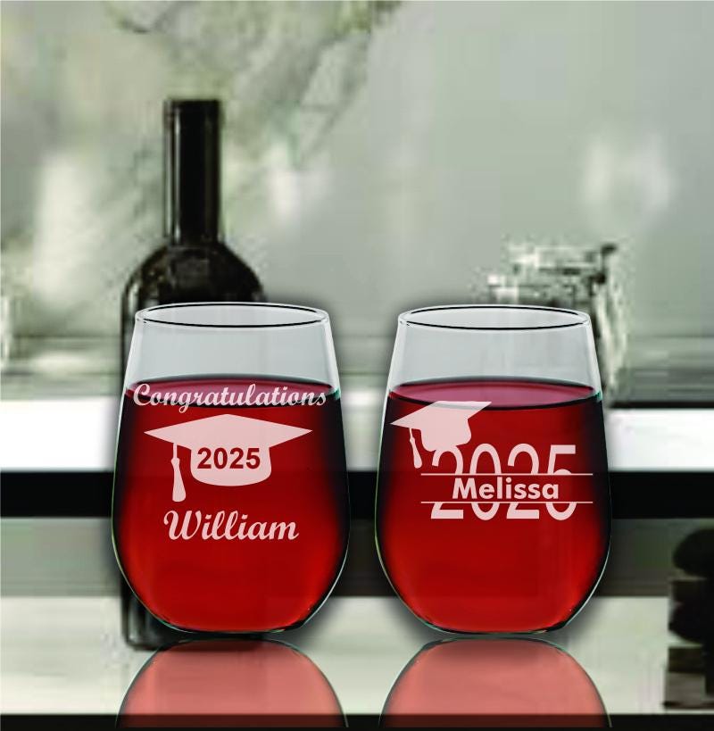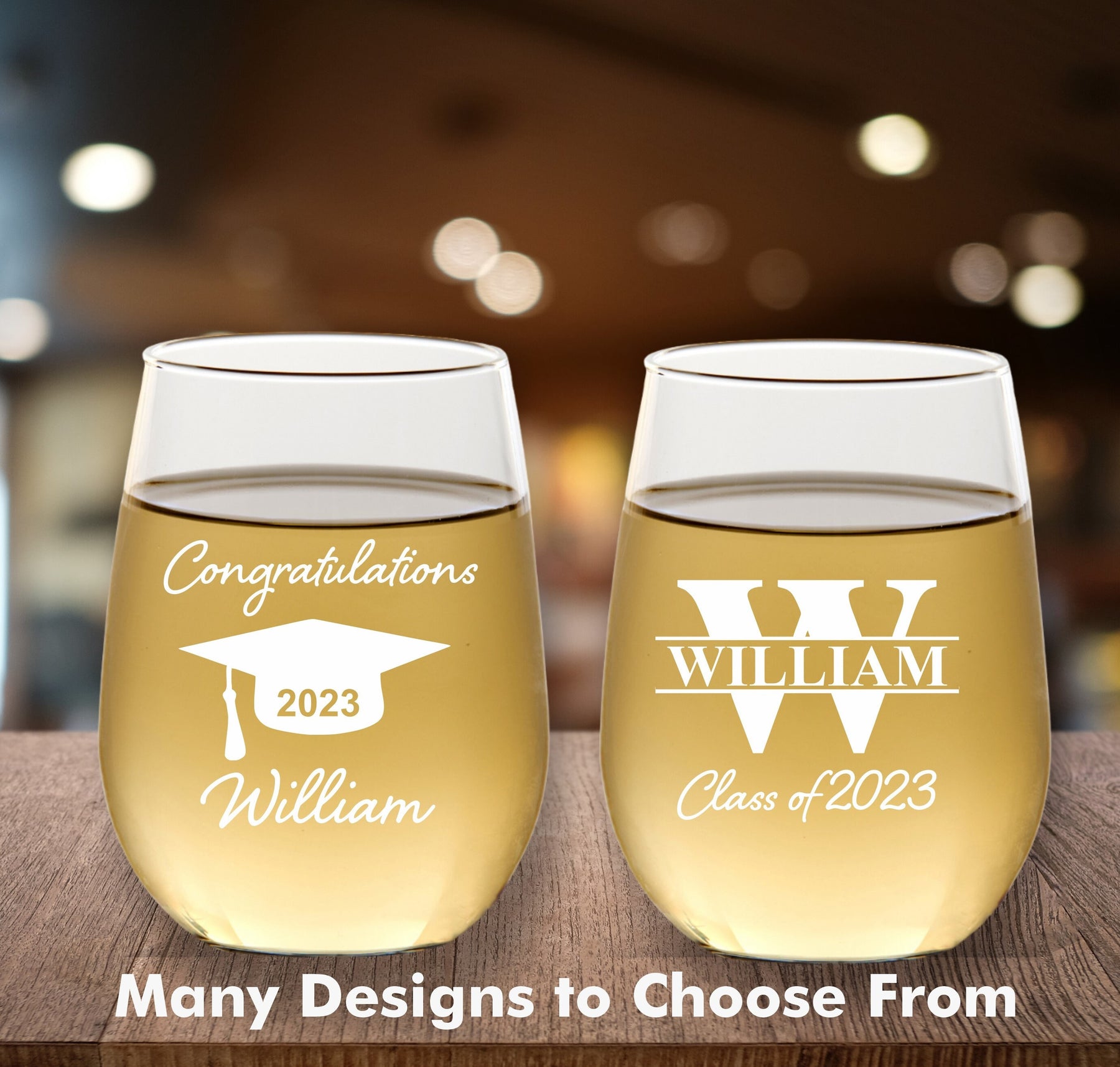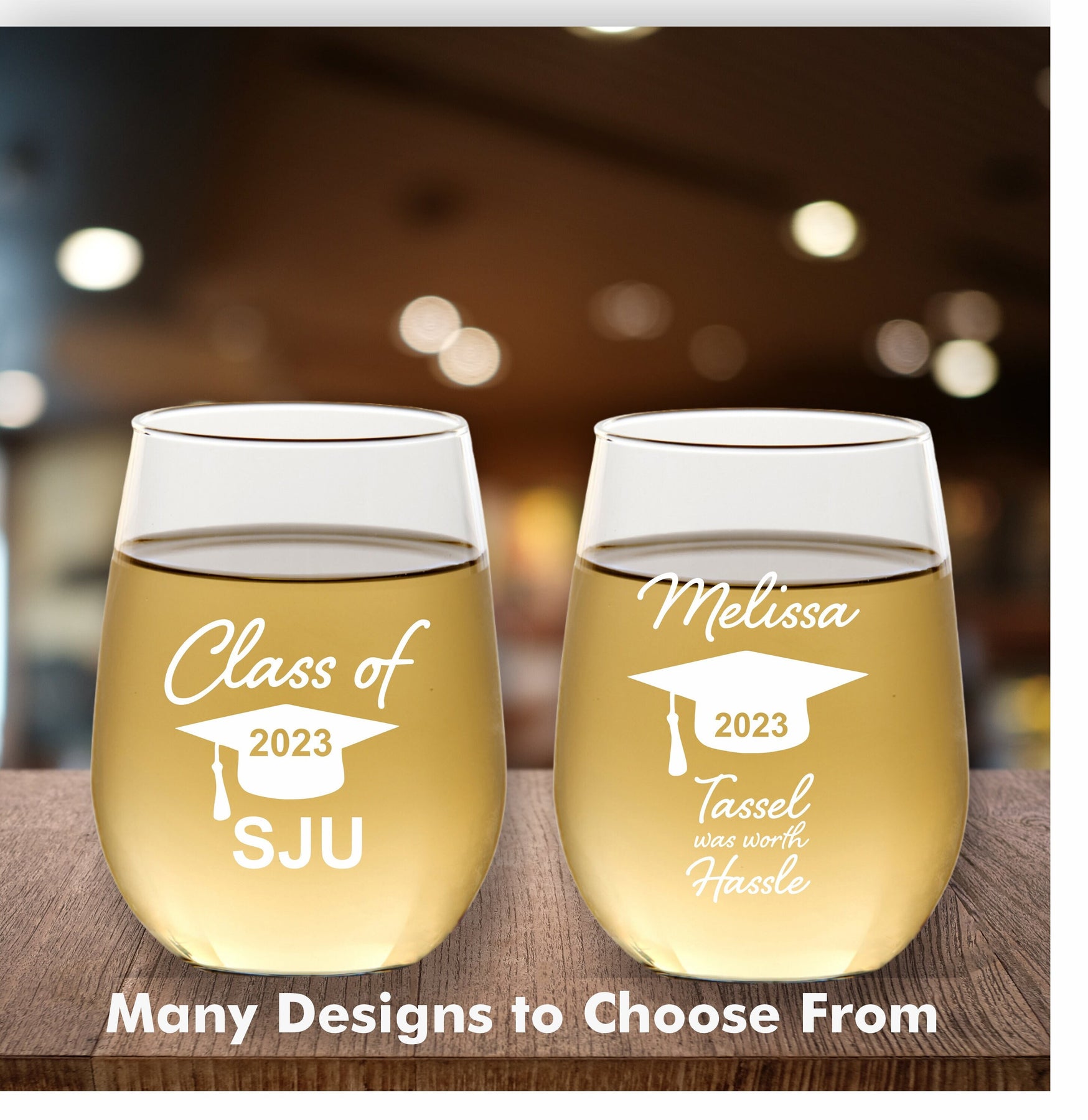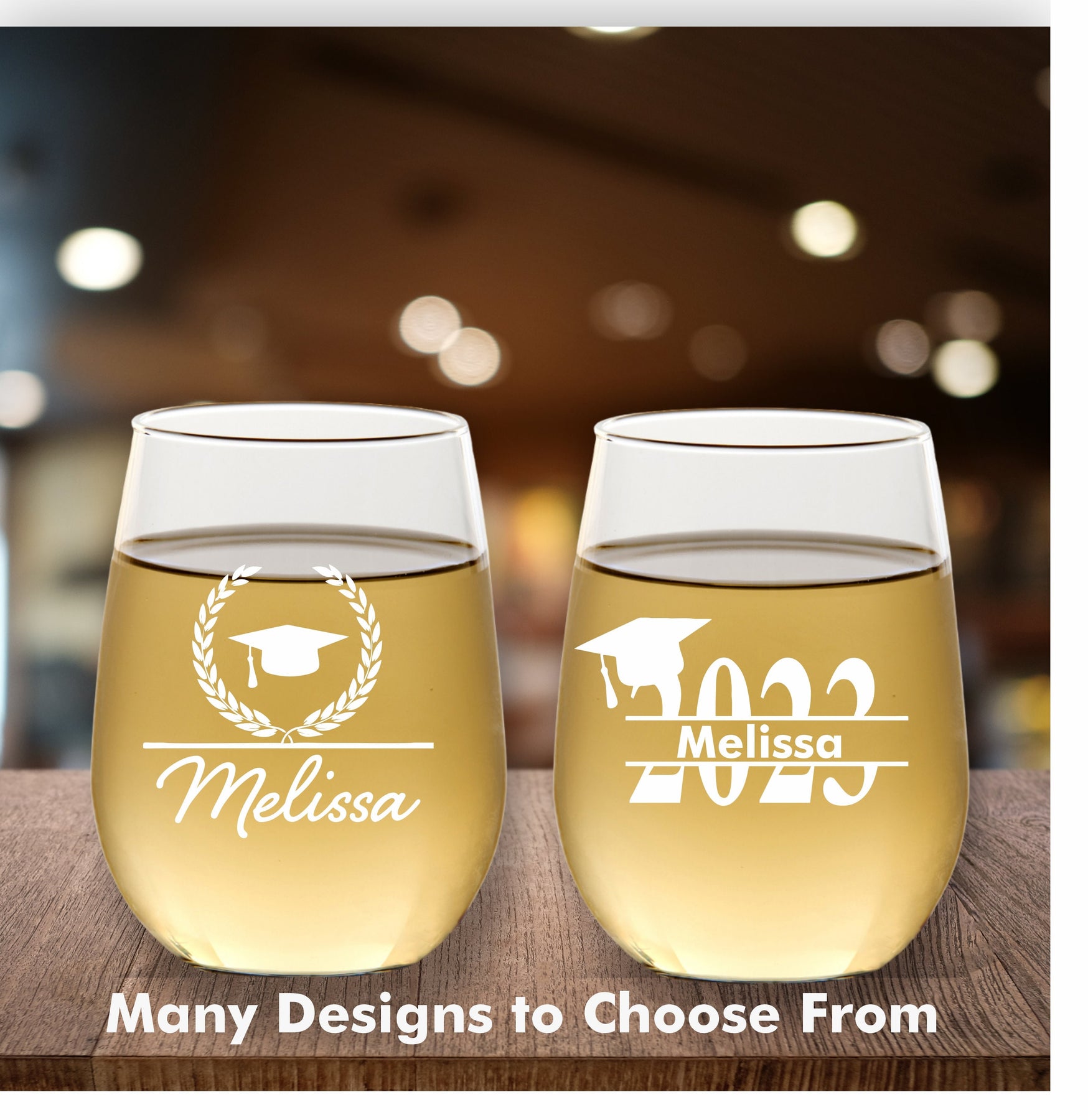Each glass is professionally laser engraved with your chosen design from our wide selection – no stickers or paint that peel over time. Designed and engraved in-house right here in the USA, these glasses are a lasting keepsake for your graduation celebration.