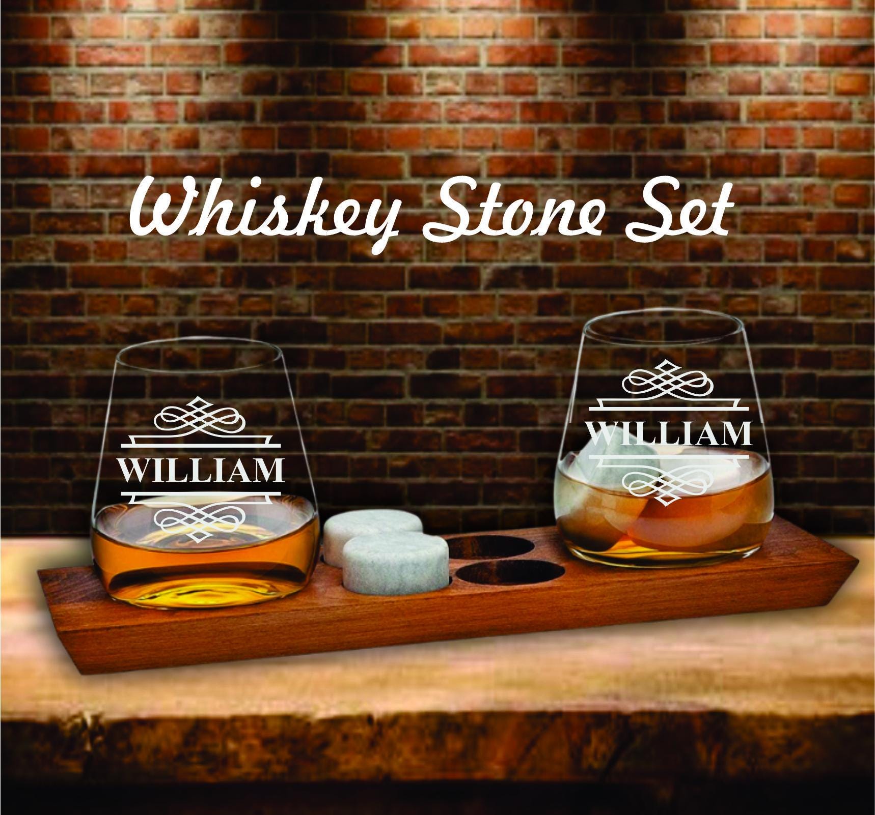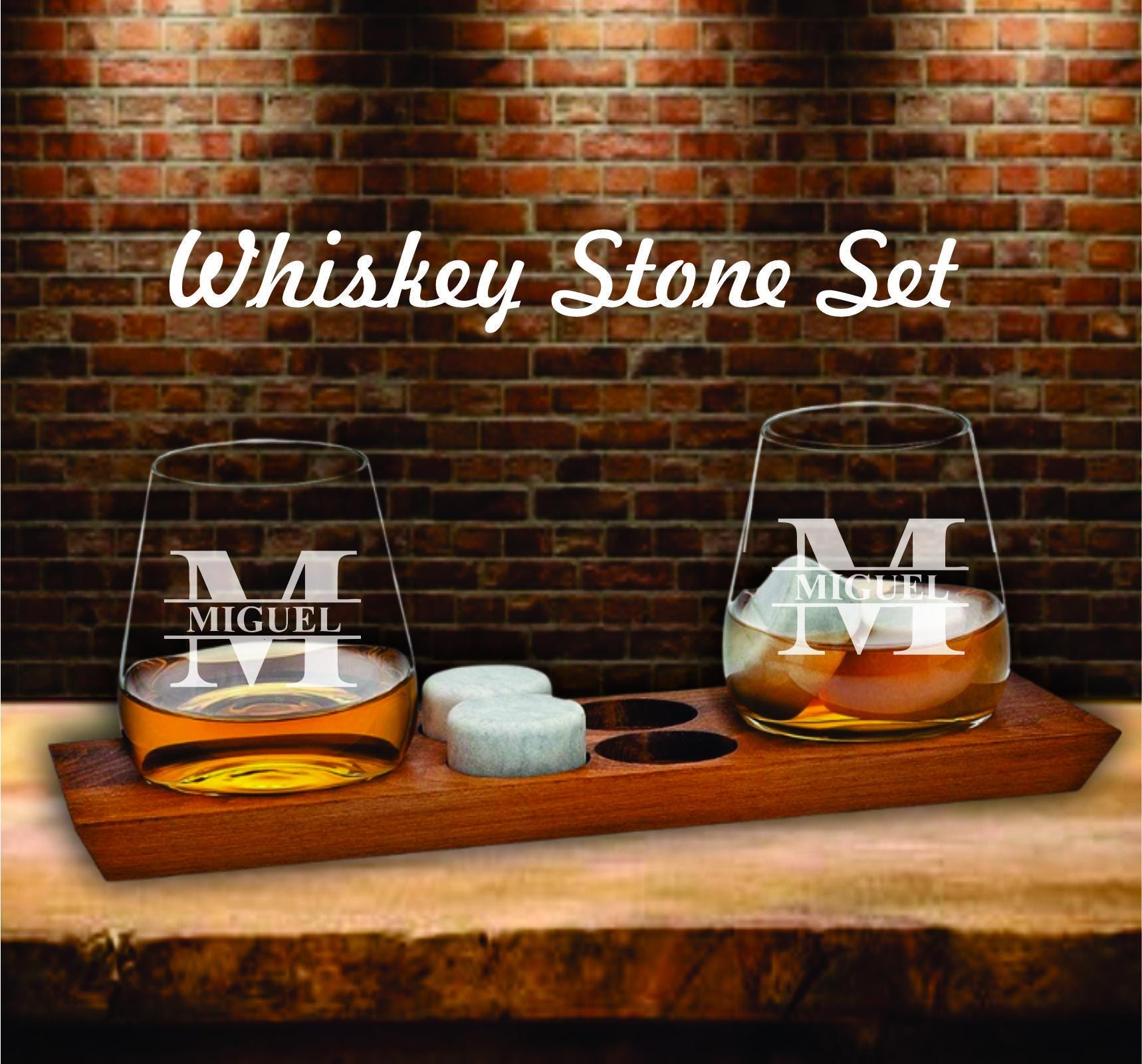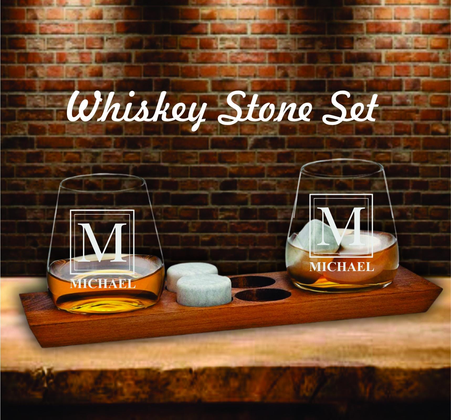 Personalized Bourbon Glasses Gift Set – Whiskey Stones & Wood Tray - Home Bar Drinkware Gift - Birthday