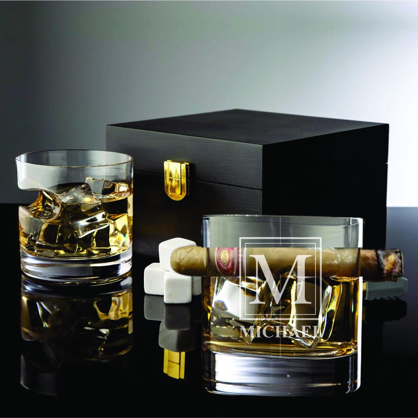 Whiskey Glass Cigar Holder & Stones Gift Set – Personalized Bourbon Glasses - Elegant Wooden Gift Box Option - Cigars Holder