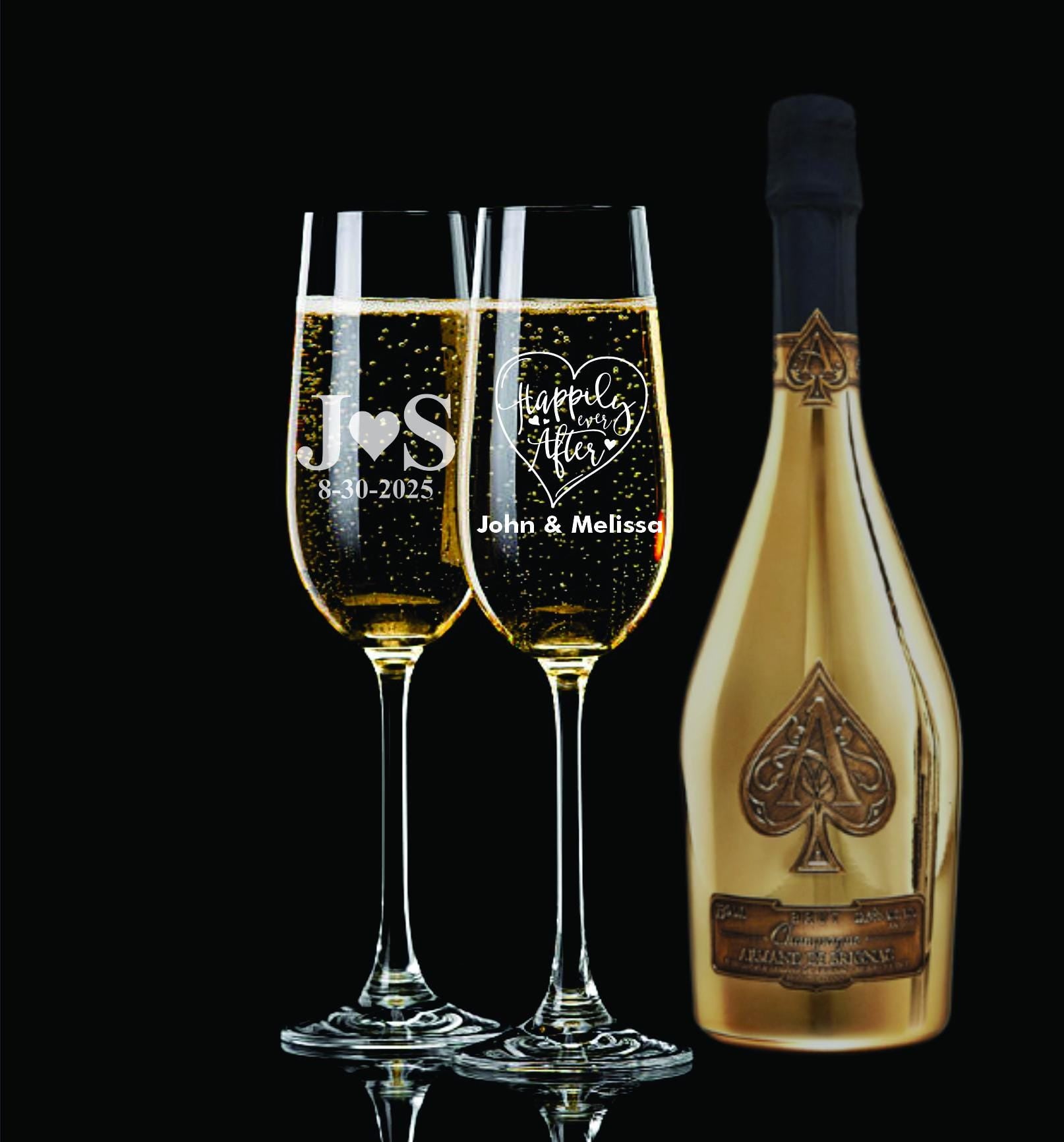 Choose from our themed “Let Our Adventure Begin” artwork, or personalize with names, initials, and dates to make each glass unique. These flutes are more than favors—they’re souvenirs of your love story’s first step.